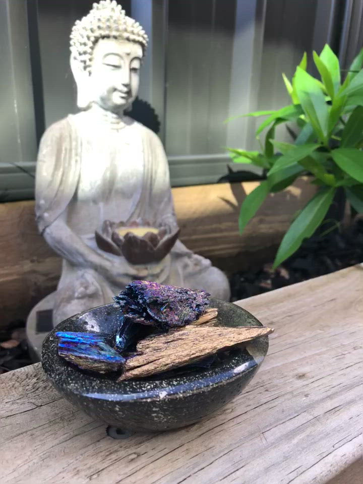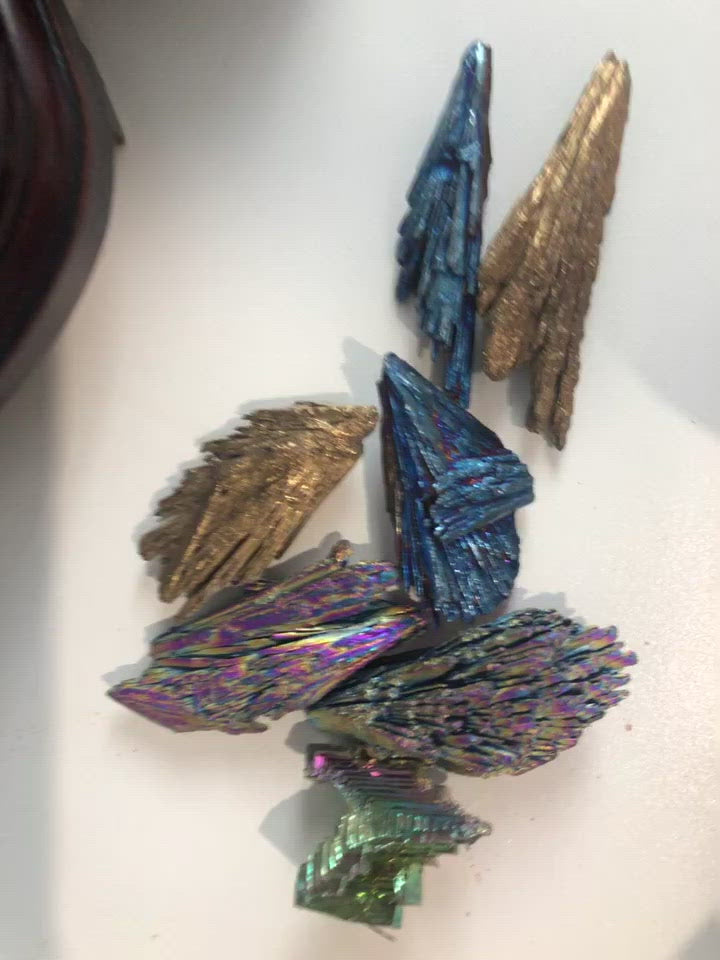 Black kyanite crystals are taken into a superheated process. In this process, the crystals are coated with metallic vapors from different metallic coatings.