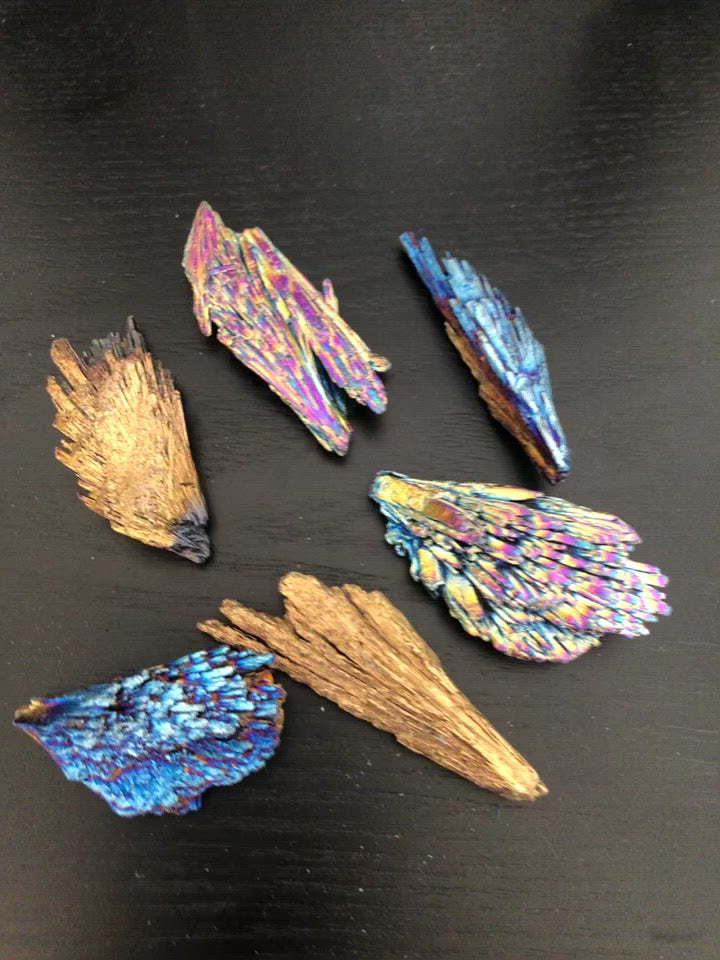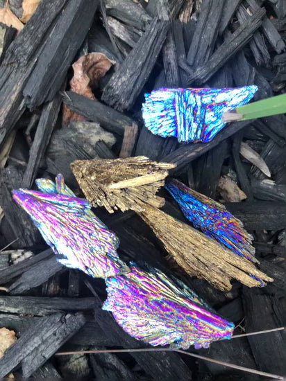 Rainbow aura crystals are made with a mix of titanium and platinum atoms fused into the kyanite's surface.